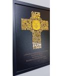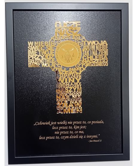 Złoty krzyż z modlitwą "Ojcze Nasz" wycięty z lustrzanego plexi 3mm umieszczony na czarnym tle z personalizowanymi życzeniami.