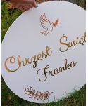 Biała tablica Chrzest Święty + imię ze złotym napisem i dekoracjami.