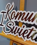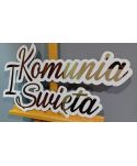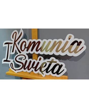 Biała tablica PIERWSZA KOMUNIA ŚWIĘTA ze złotym napisem.