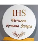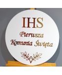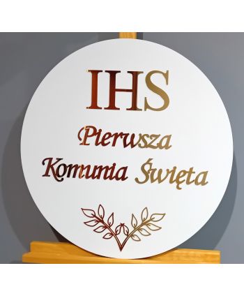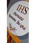 Biała tablica PIERWSZA KOMUNIA ŚWIĘTA ze złotym napisem i dekoracjami.