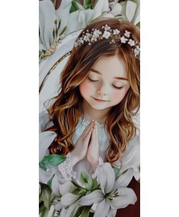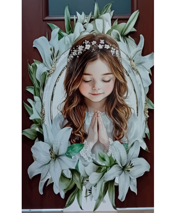 Drewniana biała tablica PIERWSZA KOMUNIA ŚWIĘTA ze złotym napisem i dekoracjami.