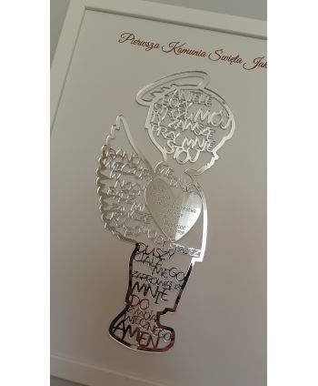 Srebrny aniołek z modlitwą "Aniele Boży" wycięty z lustrzanego plexi 3mm umieszczony na białym tle z personalizowanymi życzeniami.
