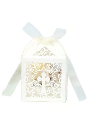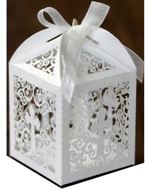 Pudełka z krzyżem i ażurowym wzorem sercem wycinane z wykrojnika z białego papieru.