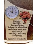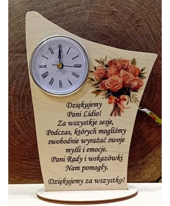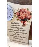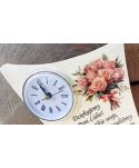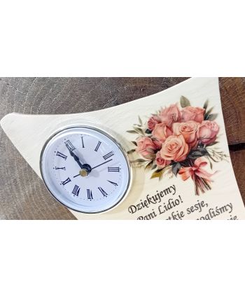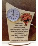 Statuetka z zegar z ozdobnym wzorek oraz personalizowanym tekstem. Dzięki temu upominek nabierze osobistego charakteru i będzie pamiątką na całe życie.