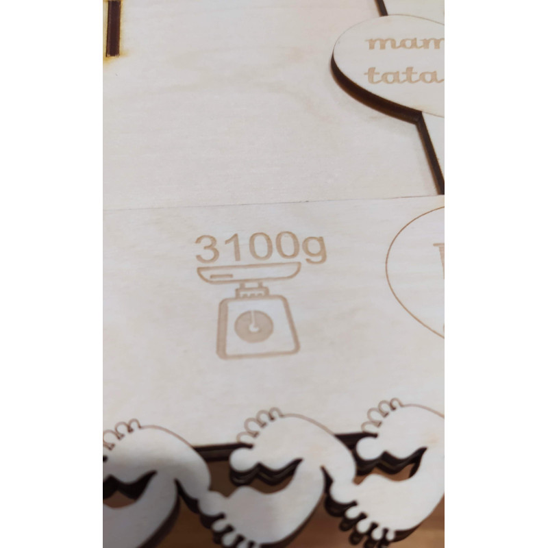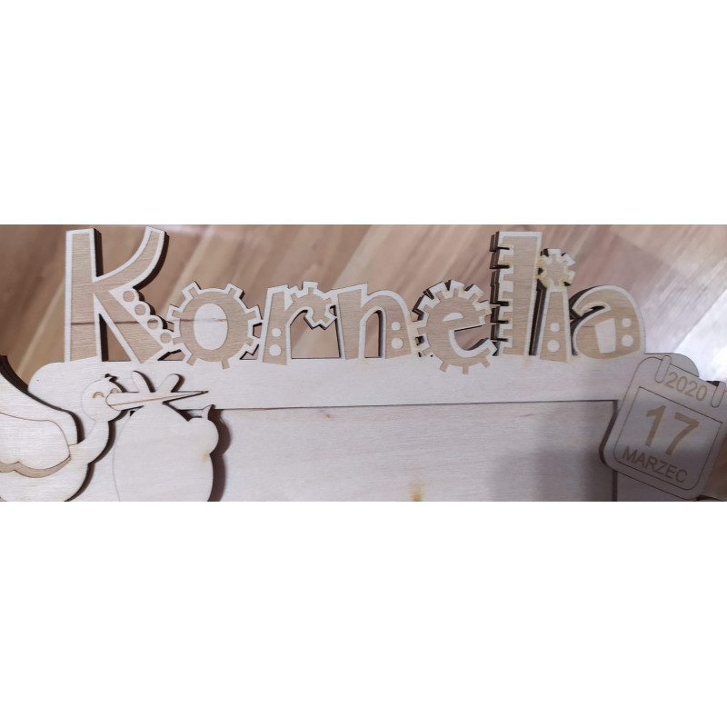Drewniana zamka na zdjęcia z metryczką dziecka.