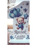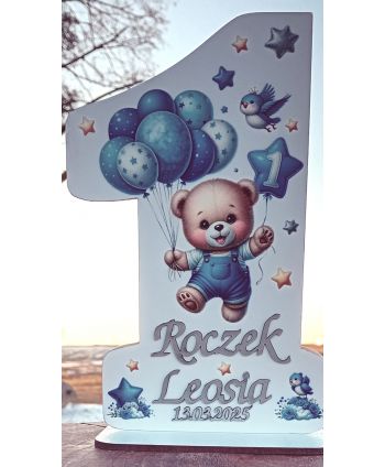 Pamiątkowa kartka -statuetka z okazji pierwszych urodzin wraz z personalizowanymi życzeniami na odwrocie.