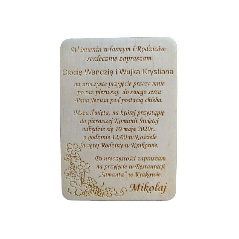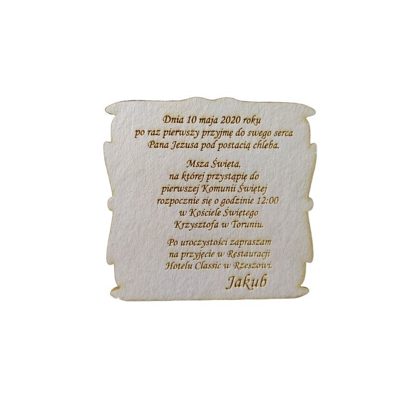 Oferujemy oryginalne drewniane zaproszenie na Pierwszą Komunię Świętą.